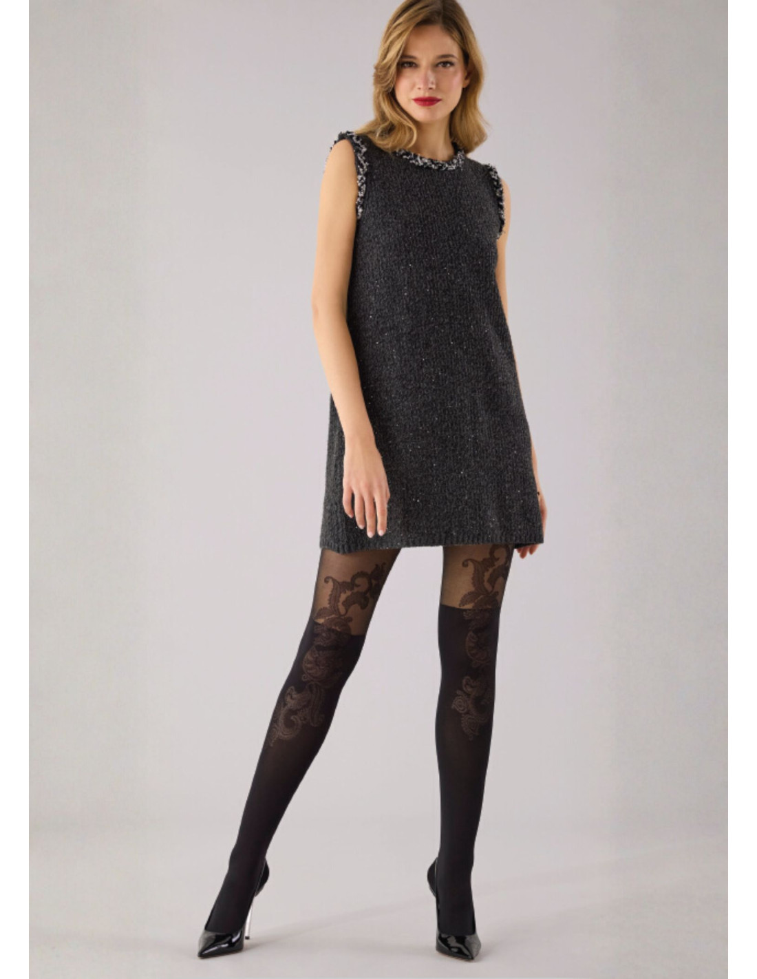 Nadkolienky a pančuchy v jednom! Dizajn, ktorý spája priehľadnú a nepriehľadnú látku, pretínajúcu sa nad kolenami, vytvára túto obľúbenú optickú ilúziu. Potlač kvetov na prednej strane, ktorá sa tiahne v oblasti kolena a stehna, im navyše dodá romantický nádych.