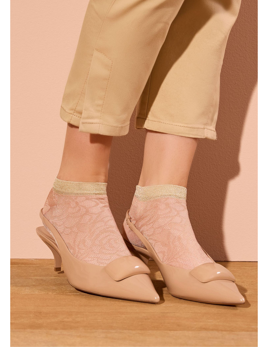 Hľadáte spôsob, ako oživiť svoje obľúbené lodičky? Tieto ponožky sú odpoveďou na najnovšie trendy. Kombinácia priehľadnej textúry, kvetinovej čipky a metalického lemu je presne to, čo váš outfit potrebuje, aby vystúpil z radu. Elegantné nízke ponožky z jemného úpletu s dekoratívnym kvetinovým vzorom. Perfektný doplnok k spoločenskej aj voľnočasovej obuvi. Noste ich k lodičkám s otvorenou pätou alebo k elegantným mokasínam. Sú ideálne na večierok, svadbu, ale aj na kávu v meste, keď chcete pôsobiť výnimočne.