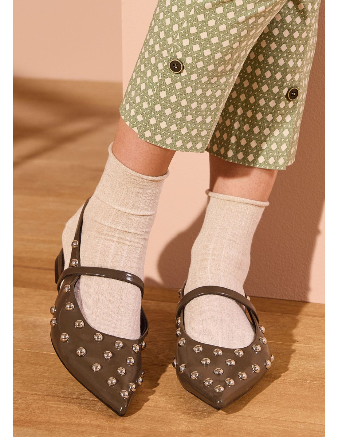 Dodajte svojmu outfitu jemný jas bez toho, aby ste pôsobili príliš prekombinovane. Naše žebrované ponožky s metalickým vláknom sú navrhnuté tak, aby zachytávali svetlo pri každom vašom kroku. Ich najväčším benefitom je štýlový rolovaný lem, ktorý nahrádza klasickú gumičku a dodáva nohe uvoľnený, priam umelecký vzhľad. Lurexové vlákno je vpletené priamo do štruktúry, čo vytvára elegantný trblietavý efekt vhodný na deň aj večer. Skombinujte ich s lakovanými lodičkami alebo vybíjanými balerínkami. Lesk ponožiek a lesk kože vytvoria luxusne pôsobiaci celok. Vďaka jednofarebnému, no textúrovanému vzhľadu sú ideálnym partnerom k nohaviciam s výrazným vzorom (káro, geometrické tvary).