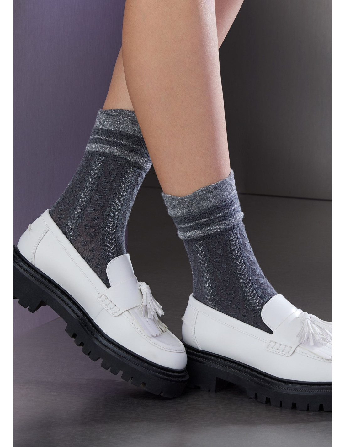 Bavlnené ponožky s kontrastným vrkočovým vzorom a lurexovým lemom, ktoré sú vhodné na každú príležitosť.
